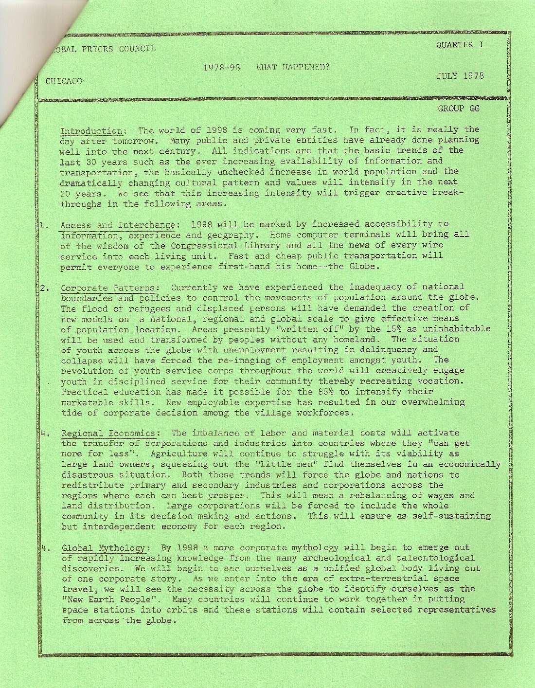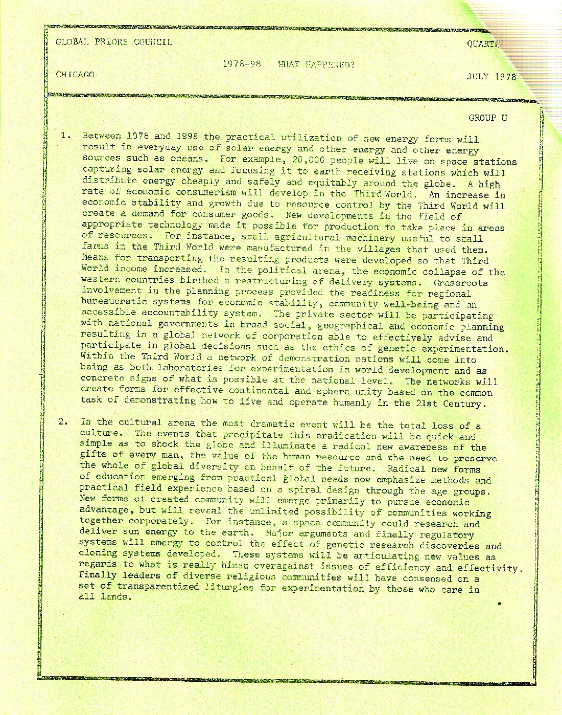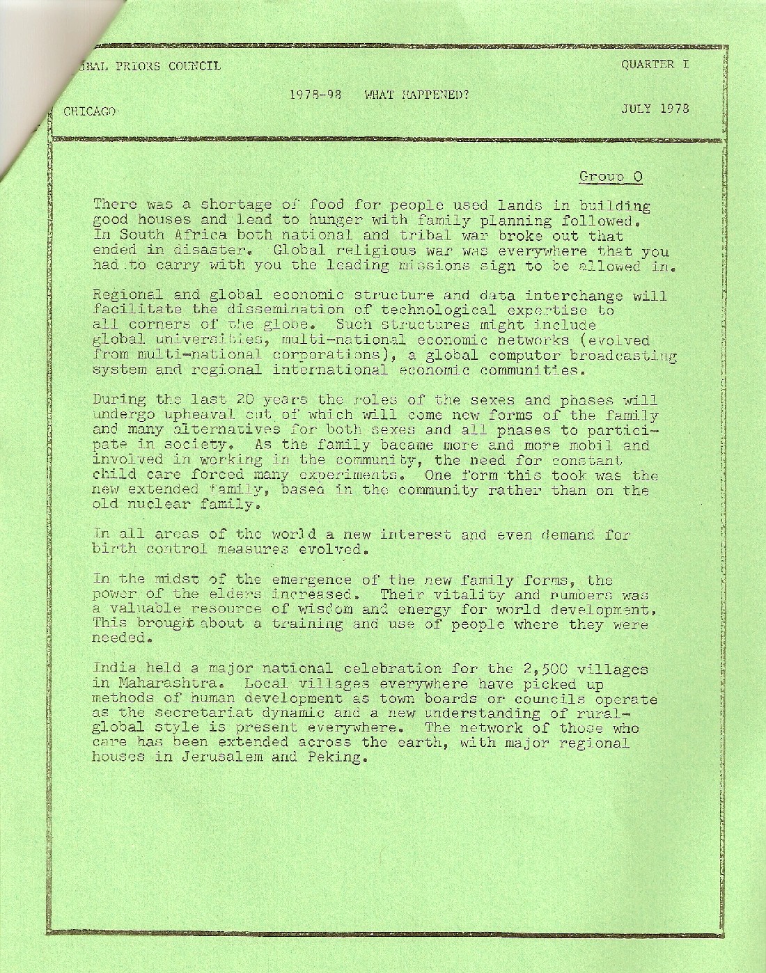 I recently came across this document in my files, dated July 1978, from the Global Priors Council following, I assume, Summer 78. It appears to have been prepared for the priors' meeting, based on work done at the summer program. The cover page describes what it is: