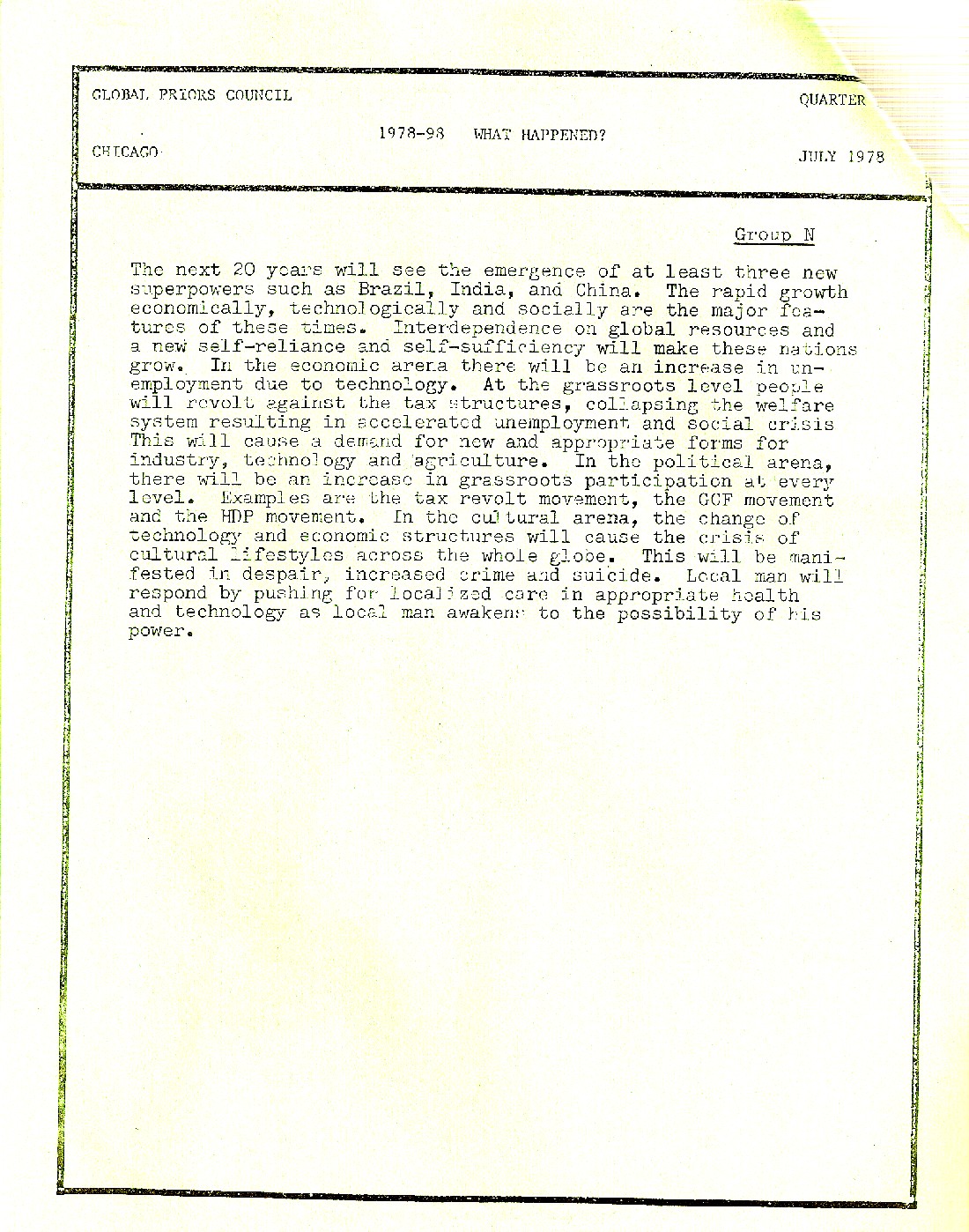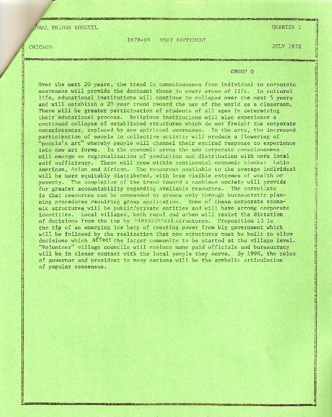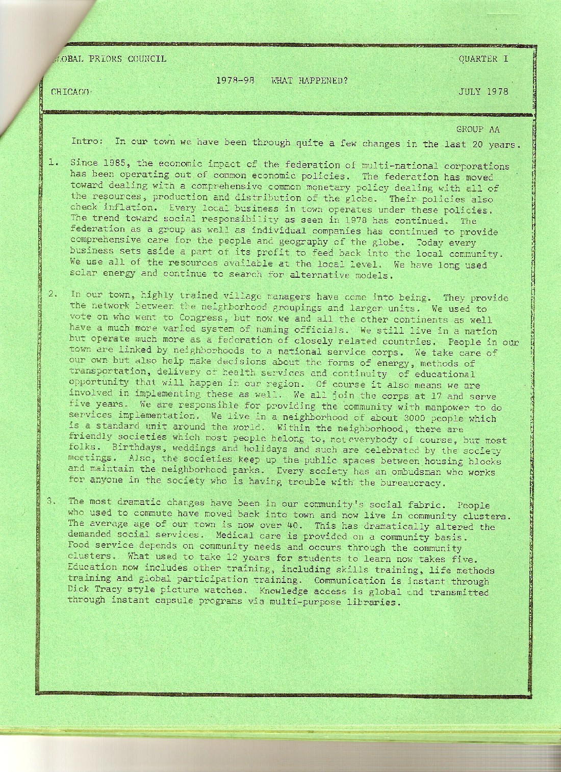 I recently came across this document in my files, dated July 1978, from the Global Priors Council following, I assume, Summer 78. It appears to have been prepared for the priors' meeting, based on work done at the summer program. The cover page describes what it is:
